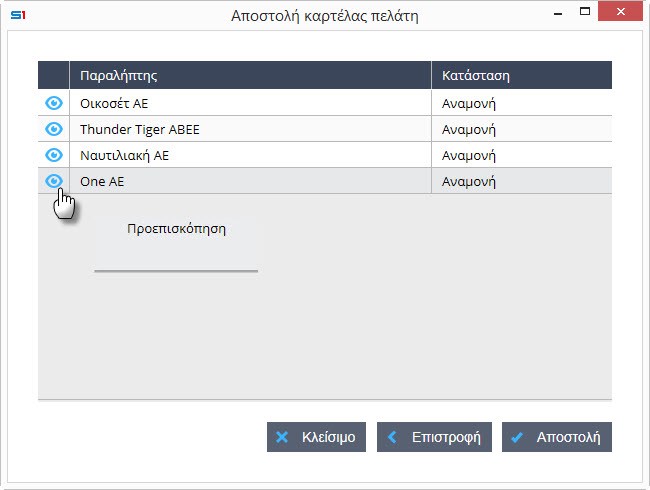 Στο επόμενο βήμα εμφανίζεται η λίστα των πελατών στους οποίους θα αποσταλεί η καρτέλα, ενώ υπάρχει και δυνατότητα προεπισκόπησης.