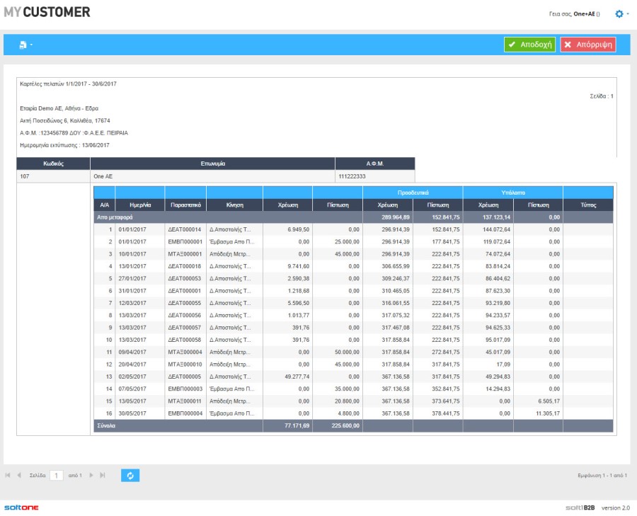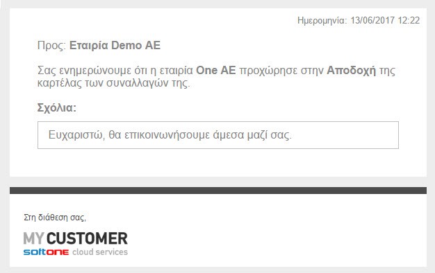 Ο πελάτης λαμβάνει ένα ενημερωτικό email, μέσα από το οποίο μπορεί να ανοίξει την καρτέλα του, να δει αναλυτικά τις κινήσεις του και να επιλέξει είτε να την αποδεχτεί είτε να την απορρίψει.